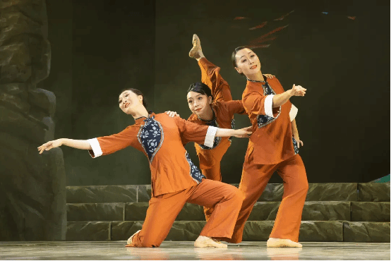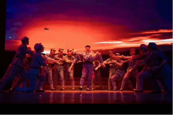 《长城·黄河·太行》通过舞台空间的象征性设计,将自然景观升华为民族精神的视觉符号。长城篇章,以冷峻的金属质感道具与豪迈的肢体语言,构建“血肉长城”的意象。舞者通过叠加的躯体造型模拟城墙的层叠感,配合暗红色灯光投射,形成“用身躯浇筑防线”的视觉表达。黄河篇章,舞者在高低错落的平台上形成“波浪”动态。舞台背景将黄河泥沙奔涌的实拍影像与抽象水墨线条结合,既保留自然力量的原始冲击,又赋予诗意化的审美升华。太行篇章,通过舞台结构模拟太行山势,战士与群众演员的群舞形成“山峦起伏”的视觉韵律。道具“红缨枪”与“纺车”的交替出现,在刚硬与柔韧的材质对比中强化军民协作的主题张力。