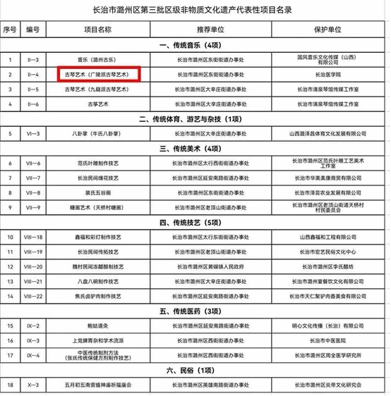 近日,长治市潞州区公布第三批区级非物质文化遗产代表性项目名录,我校申报的“古琴艺术(广陵派古琴艺术)”项目成功入选。这标志着学校在非物质文化遗产保护、中华优秀传统文化传承,特别是“医学—艺术”融合创新领域取得了新的进展。