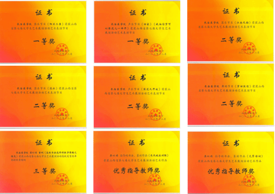 近年来,获得省级教学成果一等奖1项、二等奖2项;《音乐与大学生心理健康》获批省级首批“101计划”核心课程;主持省级教研项目8项、科研项目6项、校级教研及科研项目6项;获得省级课程思政教学设计大赛二等奖2项、三等奖1项,校级一等奖2项,三等奖2项;获得省级教学创新大赛三等奖1项,校级一等奖3项、二等奖1项;获得青年教师教学竞赛校级二等奖1项,三等奖2项;指导大学生创新创业项目20项,其中国家级2项、省级8项;获得“互联网+”创新创业大赛省级优秀奖2项,校级二等奖6项、三等奖4项;获得全国大学生艺术展演山西赛区一等奖2项、二等奖5项、三等奖5项;获得少数民族健身操国家级三等奖1项,校级一等奖1项;我校古琴传承基地获批省级优秀传统文化艺术传承基地。